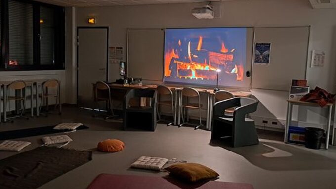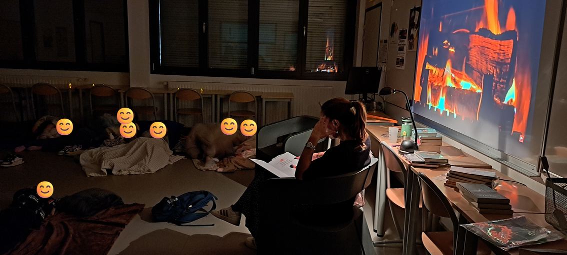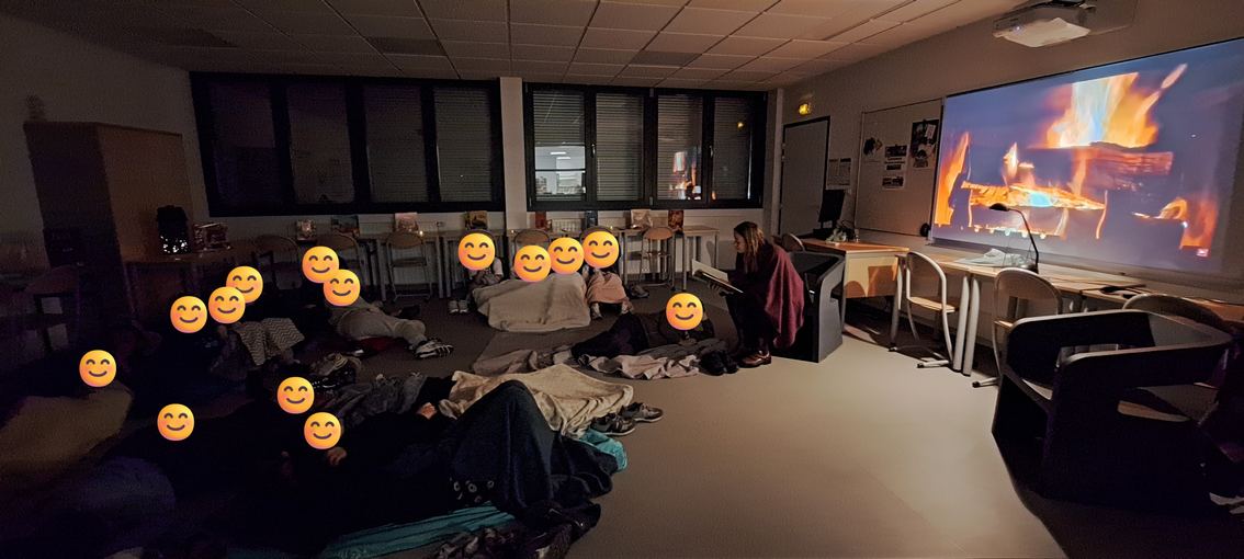 C'est au coin d'un feu crépitant, et doucement éclairés par de petites bougies-led, que les élèves se sont installés pour profiter de cet instant suspendu. Leurs professeures avaient choisi des lectures très variées, souvent en rapport avec l'une de leurs séquences (contes classiques, histoires fantastiques, Odyssée d'Ulysse, enquête policière,...) mais il s'agissait surtout de partager le goût de lire.