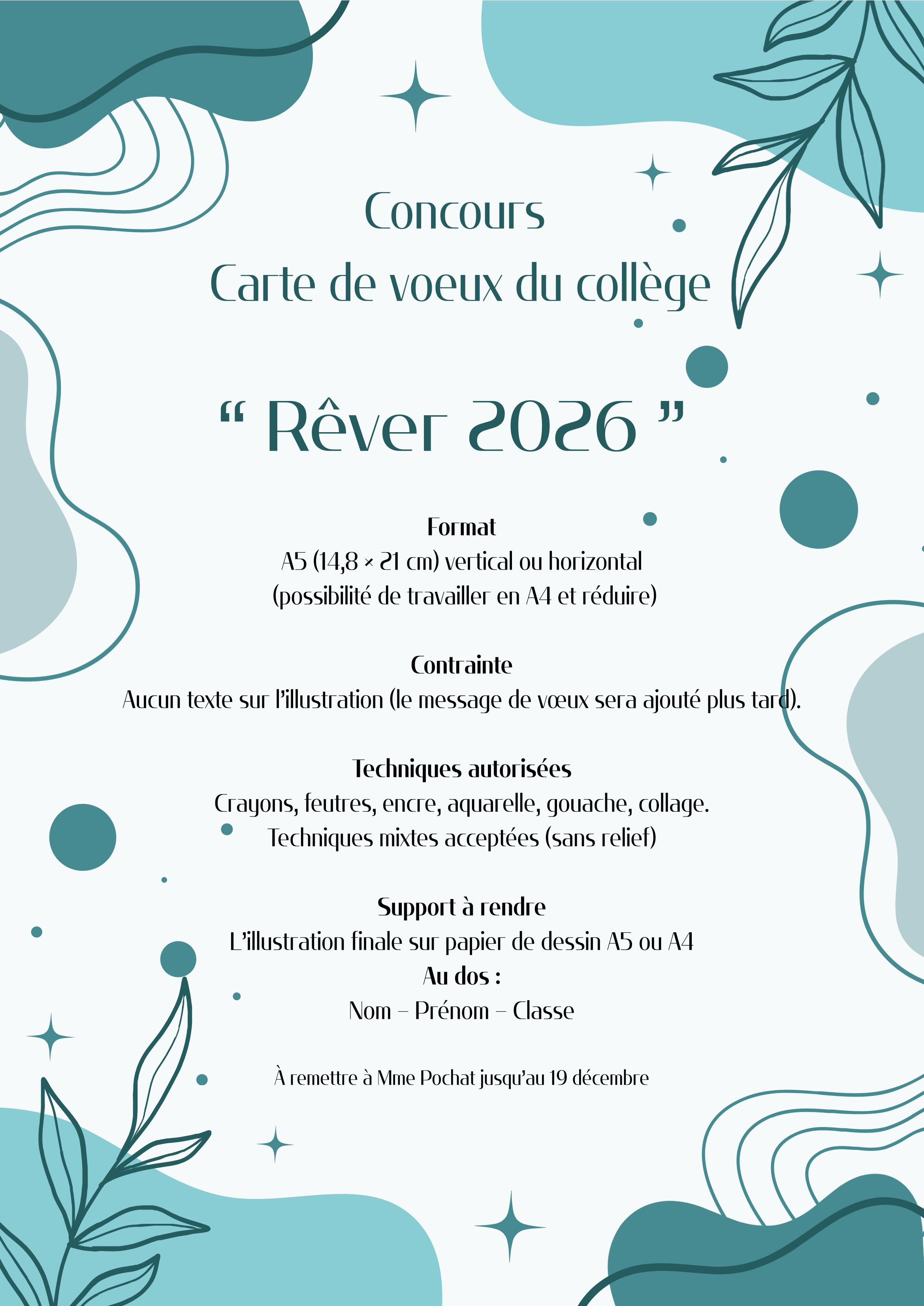 Le dessin choisi illustrera la carte de voeux officielle que le Collège envoie en janvier à ses partenaires : Mairies, Associations, Parents,... Alors, lance-toi et dis-nous comment tu "rêves 2026" !