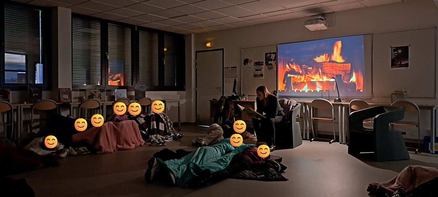 C'est au coin d'un feu crépitant, et doucement éclairés par de petites bougies-led, que les élèves se sont installés pour profiter de cet instant suspendu. Leurs professeures avaient choisi des lectures très variées, souvent en rapport avec l'une de leurs séquences (contes classiques, histoires fantastiques, Odyssée d'Ulysse, enquête policière,...) mais il s'agissait surtout de partager le goût de lire.