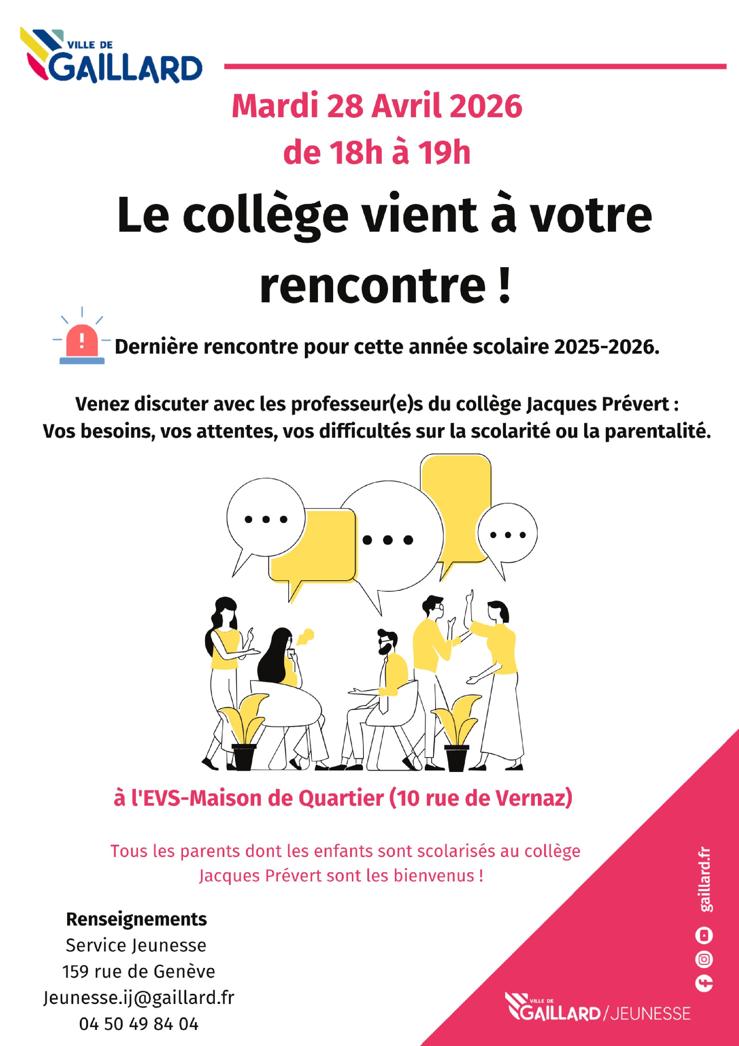 Rencontre Parents-collège à l'EVS - Maison de Quartier à Gaillard le mardi 28 avril